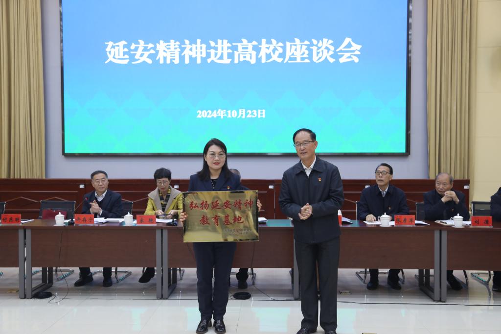 会上,青海省延安精神研究会秘书长付东明为beat365授予“弘扬延安精神教育基地”牌匾。