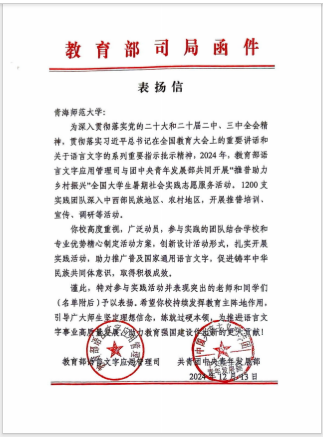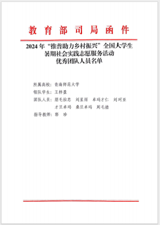 近日,由教育部语言文字应用管理司、共青团中央青年发展部联合开展的2024年“推普助力乡村振兴”全国大学生暑期社会实践志愿服务活动评选结果揭晓,化学化工学院郭珍老师带队赴青海省海南藏族自治州共和县倒淌河镇的“倒淌河推普志愿团队”,从全国1200支团队中脱颖而出,获评优秀团队。教育部语言文字应用管理司和共青团中央青年发展部来信表扬。