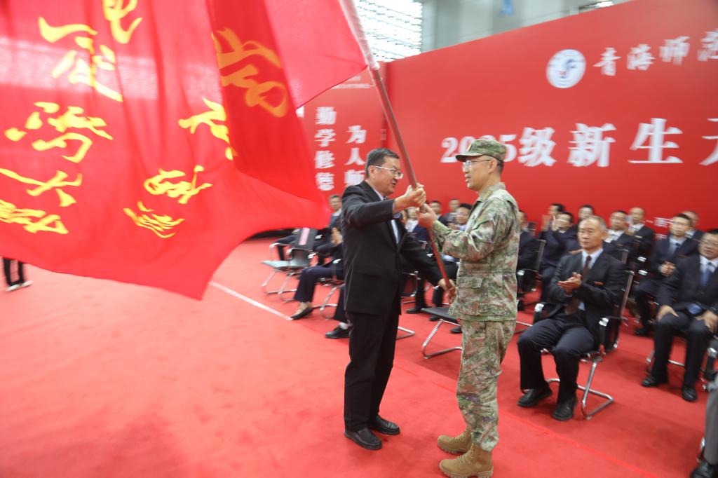 校党委书记毛学荣为2025级新生军训承训部队负责人授旗后,开学典礼圆满结束。