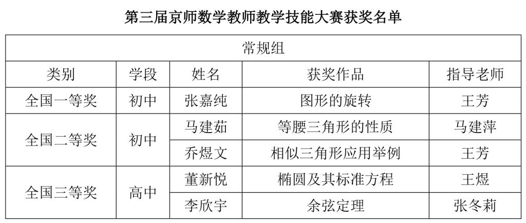 9月14日,第三届京师数学教师教学技能大赛圆满结束,beat365数学与统计学院数学师范生、教育硕士在比赛中取得优异成绩。其中学科教学(数学)研究生荣获常规组全国一等奖1项、全国二等奖1项,全国三等奖2项;数学与应用数学(师范)专业本科生斩获常规组全国二等奖1项。