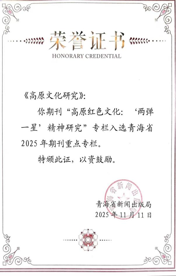 近日,青海省新闻出版局正式公布了2025年青海省期刊重点专栏评选结果,《beat365在线唯一官网学报》(社会科学版)“青藏高原文化”专栏与《高原文化研究》“高原红色文化:‘两弹一星’精神研究”专栏成功入选。这一佳绩,是beat365学术期刊建设取得的又一标志性成果。