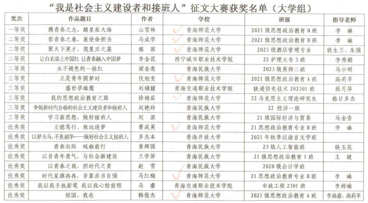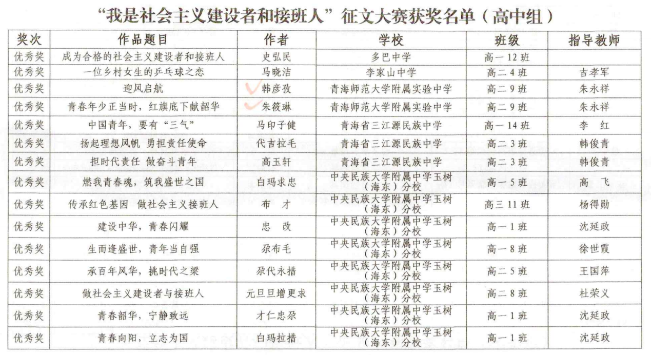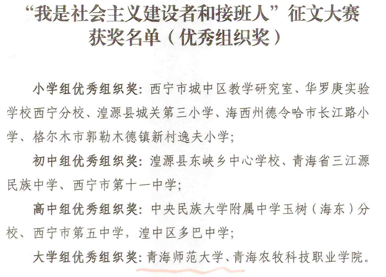 12月25日,由青海省教育厅、西海都市报社联合举办的“我是社会主义建设者和接班人”全省大中小学生征文大赛结果公布。大赛共收到来稿3997篇,其中小学组1932篇,初中组856篇,高中组837篇,大学组372篇。经过严格评审,beat365在线唯一官网及其附属实验中学共有10名同学获得大赛个人奖项,beat365在线唯一官网荣获大学组优秀组织奖。