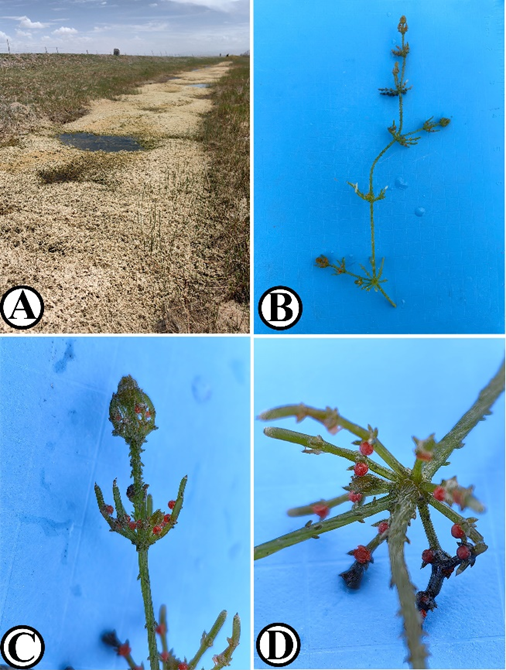A.拟球状轮藻生境;B.拟球状轮藻植株;C和D.拟球状轮藻小枝和生殖器官