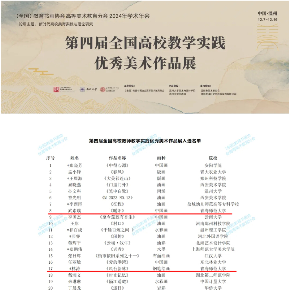 12月8日上午,全国教育书画协会高等美术教育分会2024年学术年会暨第四届全国高校教学实践优秀美术作品展在温州大学开幕。本次活动由全国教育书画协会高等美术教育分会主办,温州大学美术与设计学院承办,经组委会审核共有260幅(件)作品入选本次展览。美术学院教师林涛、武素璞的作品在此次全国性展览作品中脱颖而出,成功入选,其中林涛老师的作品《凤台新咏》获本次展览唯一设立奖项——提名奖。