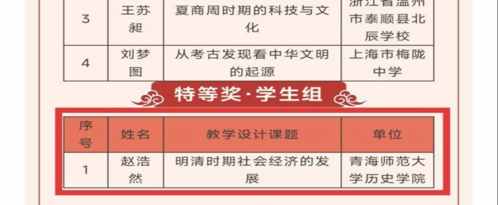 9月4日,由《中学历史教学参考》主办的首届“历史教学设计大赛”评选结果正式公布。历史学院2023级历史A班赵浩然同学,凭借其教学设计作品《明清时期社会经济的发展》荣获学生组唯一的特等奖。此奖项不仅肯定了赵浩然同学的个人才能,也展示了历史学院在人才培养方面的卓越成果。
