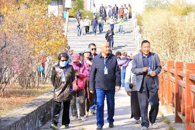 下午14时30分,健步走活动正式拉开帷幕。工作人员与校研究生会志愿者贴心陪同,老同志们精神矍铄,迈着稳健的步伐沿北川河步道前行。此时的北川河湿地公园正值最美秋景,层林尽染间,潺潺河水倒映着蓝天与树影,偶有野鸭掠过水面,勾勒出一幅灵动的秋日画卷。