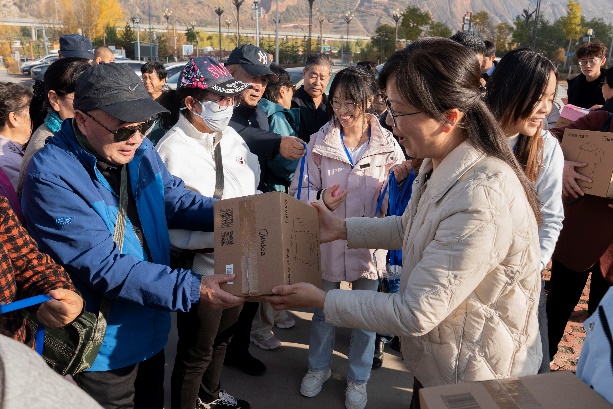 健步走活动结束后,在河畔广场慰问每位老同志,工作人员手捧重阳节慰问品,逐一送到他们手中。一句句真诚的祝福,一声声暖心的关怀,让老同志们脸上洋溢着幸福的笑容。