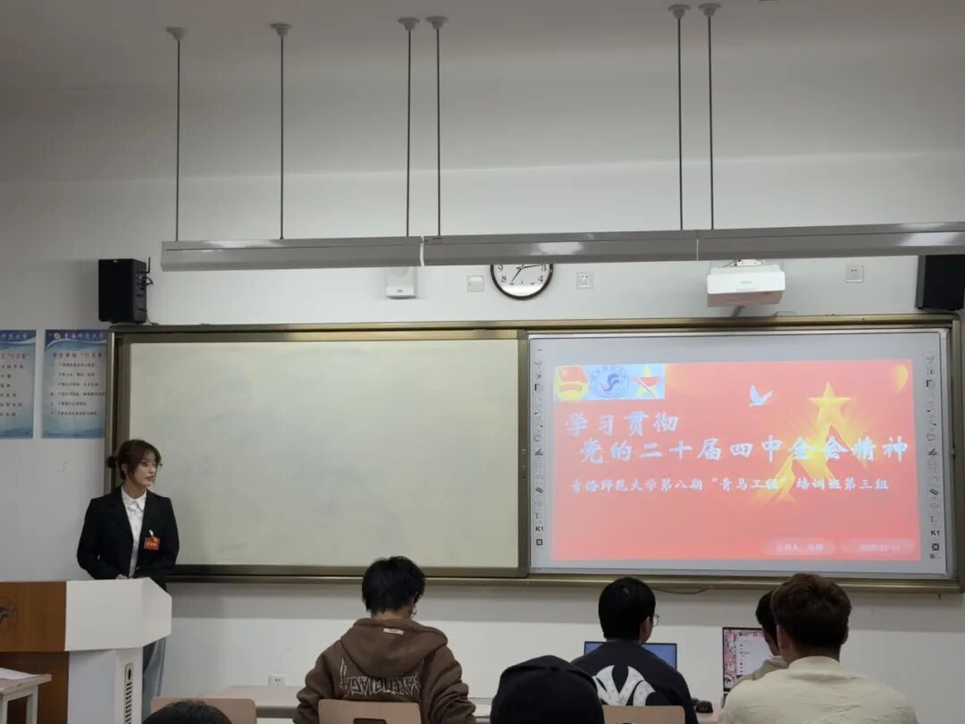 11月11日晚,校青马工程第三组学员为2024级自然地理资源环境团支部开展“学习贯彻党的二十届四中全会精神”专题宣讲。本次活动有40名听众参与,宣讲围绕全会的重大意义、精神实质与实践要求,为同学们带来兼具政治高度与青春温度的思想分享。