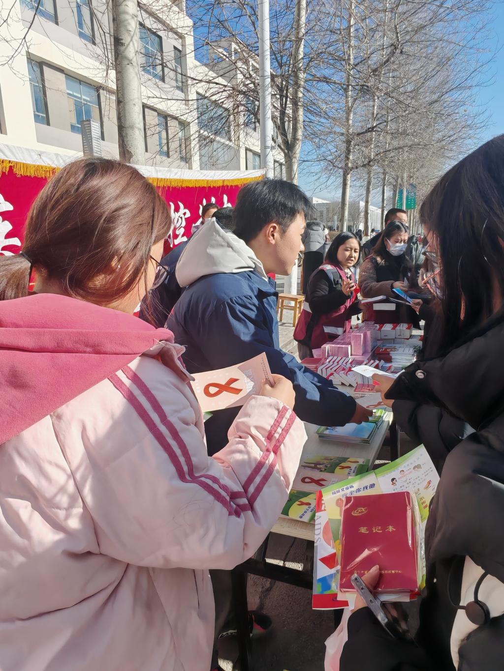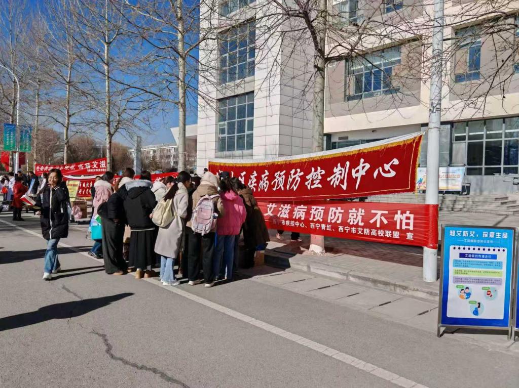 纤纤红丝带,深深健康情。12月1日中午,城北区疾控中心、西宁市妇幼保健院、西宁市健康教育所等医疗单位来校联合开展“艾滋病日”健康教育宣传活动。宣传人员统一佩戴象征着“希望、关爱与支持”的红丝带,传递着“关爱、支持、反歧视”的深深祝福,对现场师生分发宣传手册,耐心细致讲解,引导青年学生树立“每个人都是自身健康第一责任人”的健康观念,倡导文明健康生活方式。醒目的主题宣传横幅、图文并茂的健康教育展板、深入浅出的宣传彩页,丰富有趣的趣味套圈活动和健康知识现场咨询,吸引了青年学生们驻足观看,在寓教于乐、趣味宣传的过程中,让暖意与关怀脉脉相传,筑起了珍爱生命、守护健康的坚固防线。
