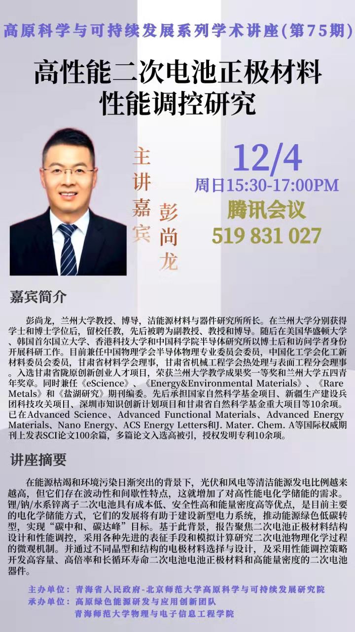 4.彭尚龙,博士,兰州大学教授,博士生导师。清洁能源材料与器件研究所所长,高科院高原绿色能源研发与应用创新团队带头人。在兰州大学分别获得学士和博士学位后,留校任教,先后被聘为副教授、教授和博导。随后在美国华盛顿大学、韩国首尔国立大学、香港科技大学和中国科学院半导体研究所以博士后和访问学者身份开展科研工作。目前兼任中国物理学会半导体物理专业委员会委员,中国化工学会化工新材料委员会委员,甘肃省材料学会理事,甘肃省机械工程学会热处理与表面工程分会理事。入选甘肃省陇原创新创业人才项目,荣获兰州大学教学成果奖一等奖和兰州大学五四青年奖章。同时兼任《eScience》、《Energy&Environmental Materials》、《Rare Metals》和《盐湖研究》期刊编委。先后承担国家自然科学基金项目、新疆生产建设兵团科技攻关项目、深圳市知识创新计划项目和甘肃省自然科学基金重大项目等10余项。已在Advanced Science、Advanced Functional Materials、Advanced Energy Materials、Nano Energy、ACS Energy Letters和J. Mater. Chem. A等国际权威期刊上发表SCI论文100余篇,多篇论文入选高被引,授权发明专利10余项。