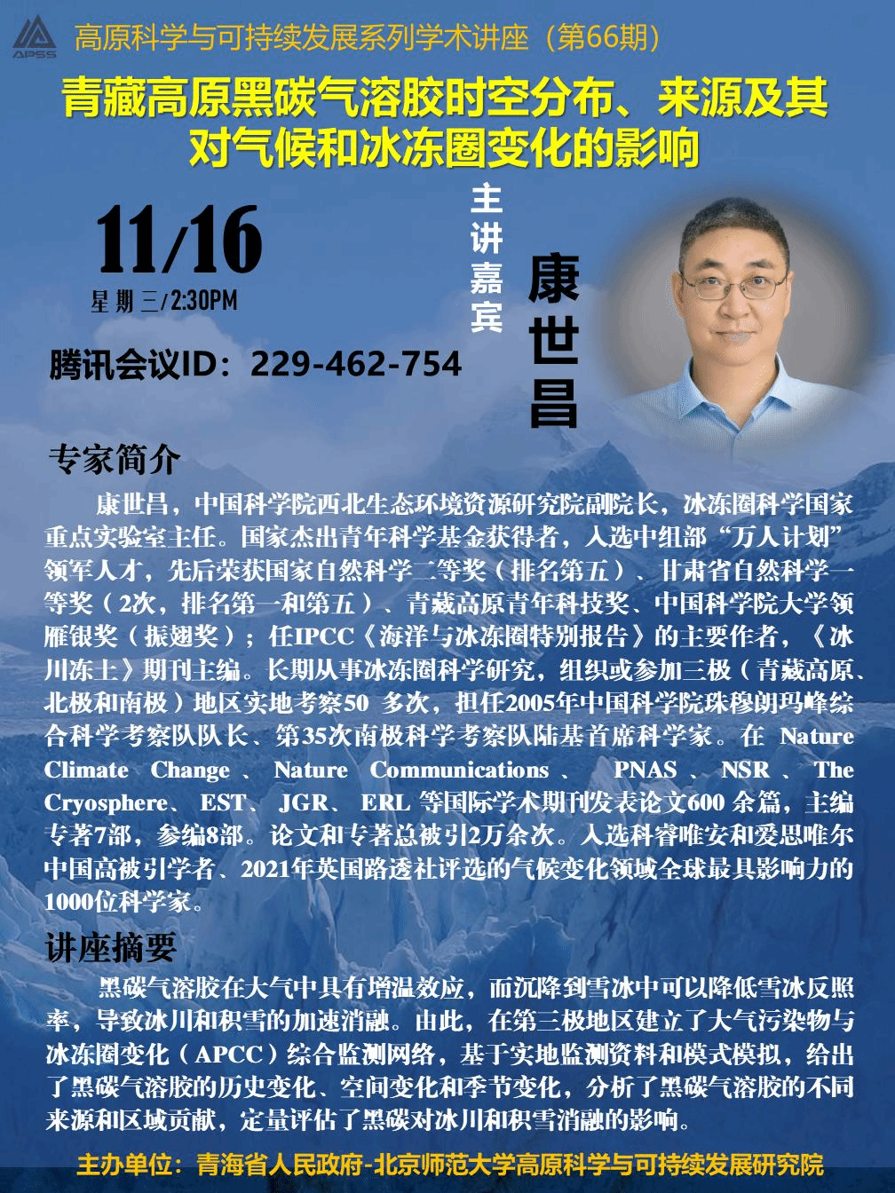 康世昌,中国科学院西北生态环境资源研究院副院长、研究员,冰冻圈科学国家重点实验室主任。国家杰出青年科学基金获得者,入选中组部“万人计划”领军人才,先后荣获国家自然科学二等奖(排名第五)、甘肃省自然科学一等奖(2次,排名第一和第五)、青藏高原青年科技奖、中国科学院大学领雁银奖(振翅奖);任IPCC《海洋与冰冻圈特别报告》的主要作者,《冰川冻土》期刊主编。长期从事冰冻圈科学研究,组织或参加三极(青藏高原、北极和南极)地区实地考察50 多次,担任2005年中国科学院珠穆朗玛峰综合科学考察队队长、第35次南极科学考察队陆基首席科学家。在 Nature Climate Change、Nature Communications、 PNAS、NSR、The Cryosphere、 EST、 JGR、 ERL 等国际学术期刊发表论文600 余篇,主编专著7部,参编8部。论文和专著总被引2万余次。入选科睿唯安和爱思唯尔中国高被引学者、2021年英国路透社评选的气候变化领域全球最具影响力的1000位科学家。
