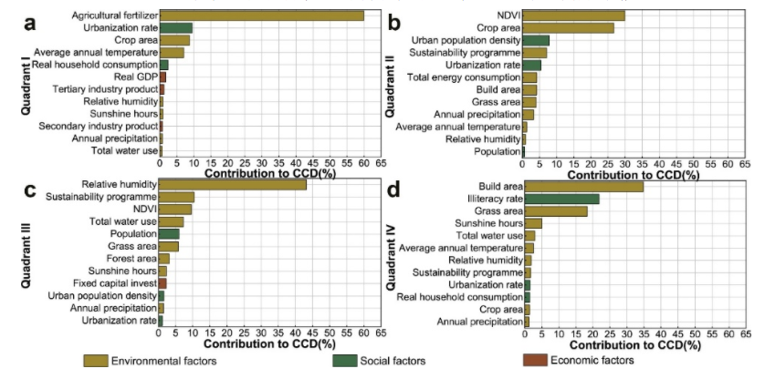 图6 2000-2018年中国省级行政区各类发展模式(a:象限I, b.象限II, c.象限III, d象限Ⅳ)下环境绩效与人类福祉之间耦合协调度动态变化的影响因素