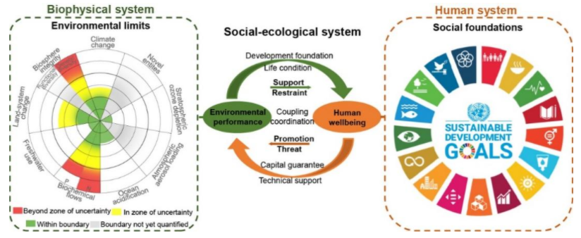 该框架整合了安全且公正的运行空间和地球系统界限约束下的环境足迹阈值/限额,从社会-生态系统耦合的视角度量与可持续发展目标相关的可持续性。人类福祉(社会基础)指标与可持续发展目标相对应,而这些目标的实现应受到以地球系统边界计量的环境足迹阈值/限额的约束。这两个子系统不是孤立的,它们之间存在复杂的耦合作用。