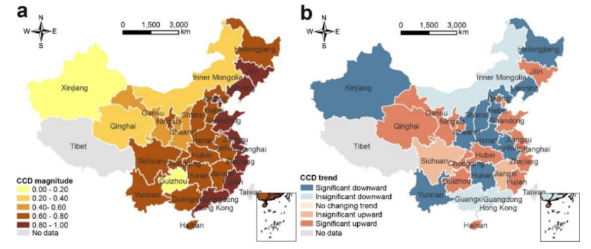 图4 2000-2018年中国区域环境绩效与人类福祉耦合协调度的大小(a)和变化趋势度(b)
