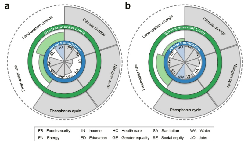 注:当内部楔形达到社会基准(人类福祉),外部楔形物处于环境足迹阈值/限额内时,国家或地区被认为处于安全且公正的运行空间。社会基础内环楔形表示相对于社会基准的实际人类福祉指标;外环楔形表示相对于环境界限的实际环境足迹。环境足迹阈值/限额用绿色环表示,社会基础用蓝色环表示;楔形测量每个维度指标与其边界(阈值/限额)相比的百分比(楔形中心数值为0%,边界数值为100%)。
